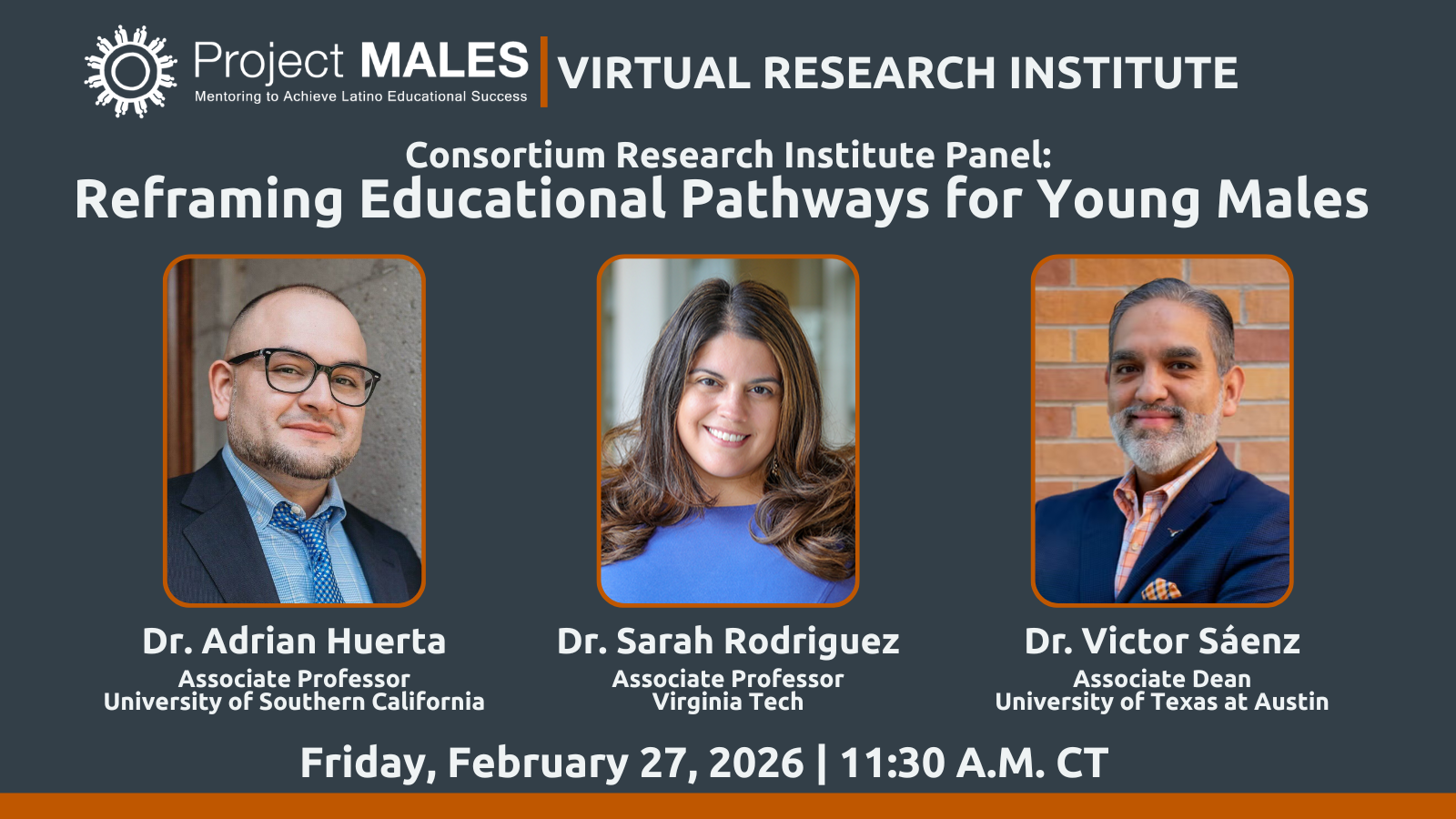 The panel will be moderated by Dr. Victor Sáenz, co-founder of Project MALES and Associate Dean of the College of Education at The University of Texas at Austin. Panelists include Dr. Adrian Huerta, Associate Professor at the University of Southern California, and Dr. Sarah Rodriguez, Associate Professor at Virginia Tech.